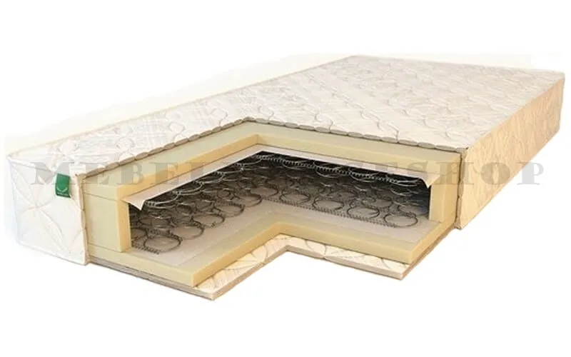 -пружинный блок, войлок, пенополиуретан, ватин, ППУ по периметру, жаккард стеганный на синтепоне.