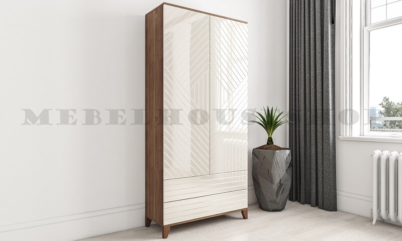 2 распашные двери, наполнение платье (ПДШ+ штанга выдвижная), 2 выдвижных ящика, направляющие 100% шариковые полного выдвижения. Открытие по нажатию push to open.